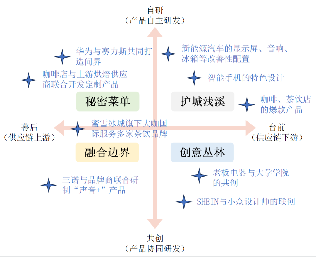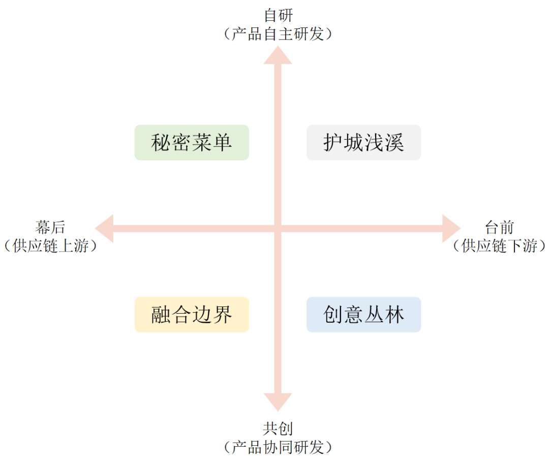 根据企业位于供应链的前端(供应商)还是后端(品牌方),在产品创新方面是自主研发为主还是协同研发产品,我们可以初步界定四个象限,来区分企业应对内卷的几种不同打法,如下图所示。