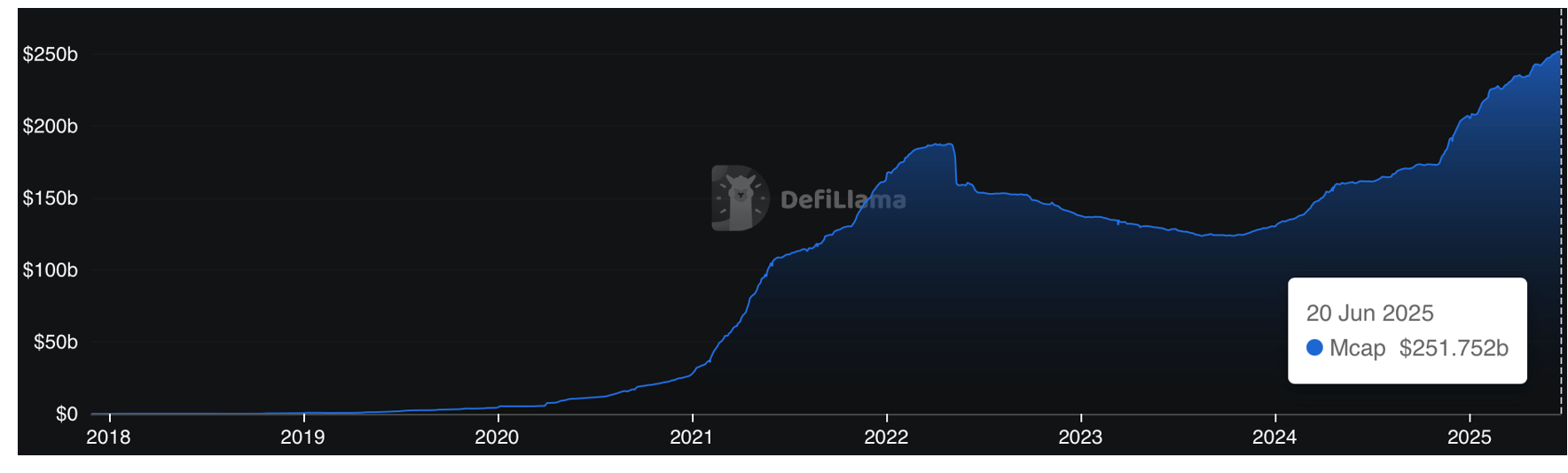 公开数据显示,截至2025年6月20日,全球稳定币存量规模约2517亿美元。