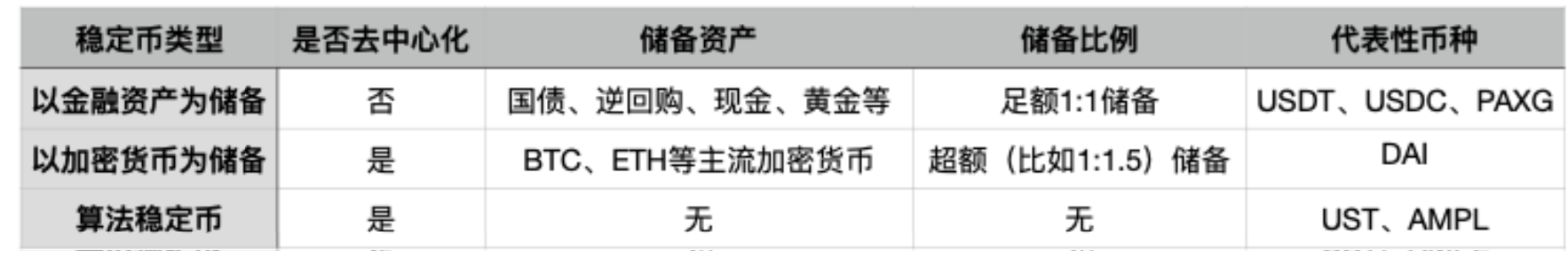 目前主要有两种与法币挂钩的机制:储备和算法,而储备又分为传统金融资产储备和加密货币储备两种。图表2是稳定币分类。