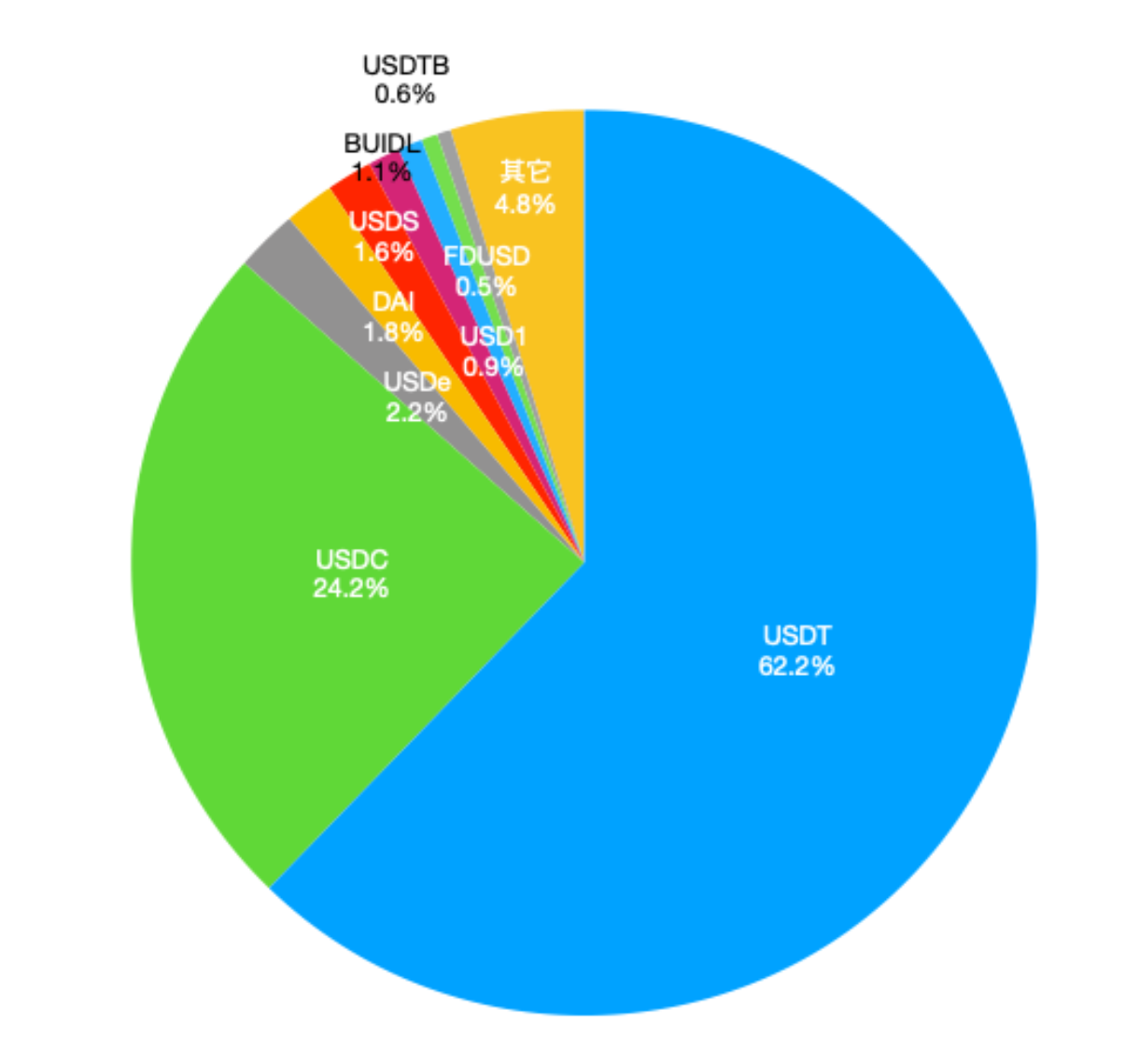 市场主导者格局呈现出“双寡头”特征,USDT和USDC合计占据全球稳定币市场约86%的份额。图表4是各稳定币规模占比。其中,USDT继续保持其市场领导地位,总市值达到1567亿美元。
