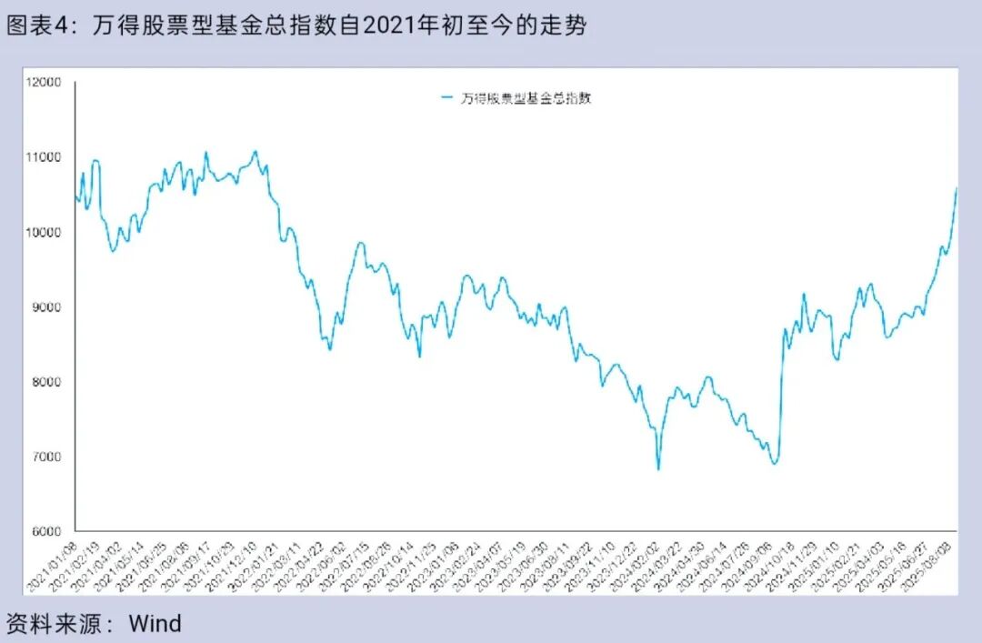 图表4是万得股票型基金总指数自2021年初至今的走势。万得股票型基金总指数包含所有股票型基金,并按规模加权,反映的是整个股票型基金市场的总体表现。该指数是总收益指数考虑了基金分红再投资的收益,衡量整个股票基金市场的总规模和总收益,反映投资者投资于整个股票基金市场所能获得的总回报。