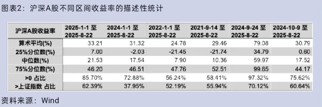 图表2是沪深A股个股在不同区间收益率的描述性统计,包括平均值、25%分位数、中位数、75%分位数和收益大于0、收益大于上证指数的上市公司数量占比。从2024年初至今,上证指数、上证50、沪深300和创业板指的涨幅均超20%。但是,在同一时间段,近30%的股票是下跌的,有25%的股票跌幅超过2%。对于一直持有这部分股票的投资者来说,“指数涨但我买的股票不涨”。