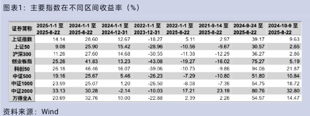 自2025年初至今(8月22日),上证指数、万得全A分别上涨14.14%、20.69%,表现出中等偏上的市场整体涨幅,而其他主要指数也录得高低不等的涨幅。