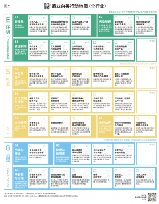 我们推荐以下两种方式使用这张地图:一是评估,二是行动。首先,这是一张评估地图,企业高管可通过标记已开展的项目,直观了解企业在ESG各维度的实践现状。其次,也是更重要的,这是一张行动地图,管理者可借助地图与团队研讨,明确未来的发力方向。