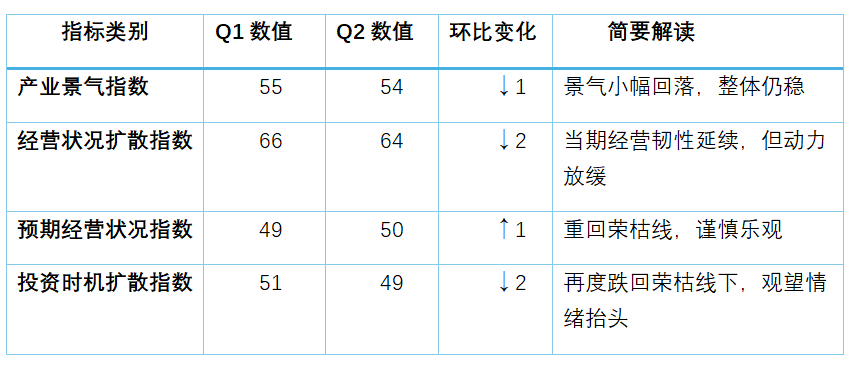 整体而言,二季度企业经营状况呈现“稳中微降、结构分化、以守为主”的特征。