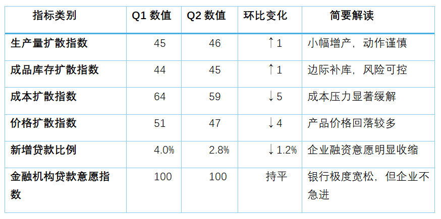 总体来看,二季度企业在生产端谨慎增产、成本端压力缓解、融资端趋于保守,呈现出在外部风声与内部微光交织下的谨慎修复态势。