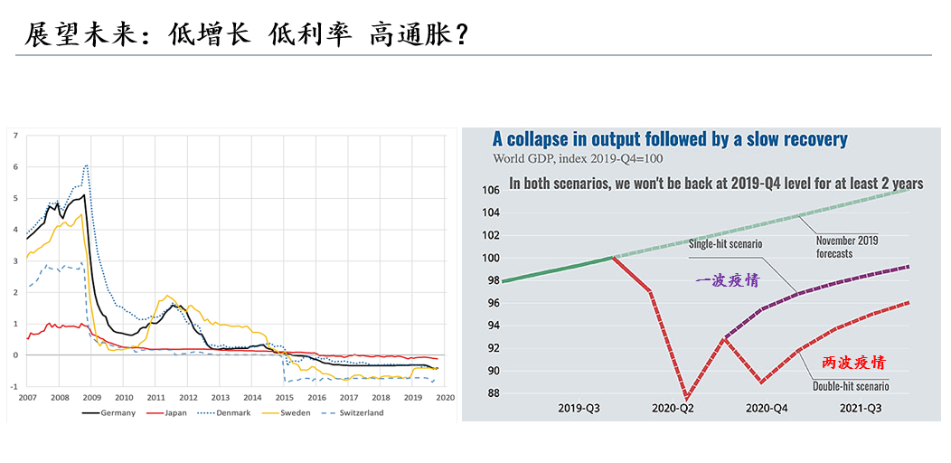 看未来,一种情况是只有一波疫情,现在慢慢过去,经济是按照一条直线走的。如果一波疫情之后再来一波,就按照下面的红线走。不管怎么走,你需要至少2、3年之后才能恢复到2019年第四季度的水平。所以未来经济增长长期来看是低增长、低利率。