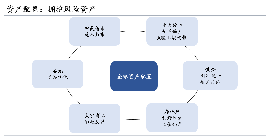 债券现在已经进入熊市了,因为经济的恢复、利率的提高,以及美联储防水的边际放缓。美国股市相对偏高,中国可能更有优势,黄金是值得持有的,未来我们会面对通胀的风险,以及各种各样不确定的风险,大众产品随着经济发展的反弹也会出现强烈地反弹。